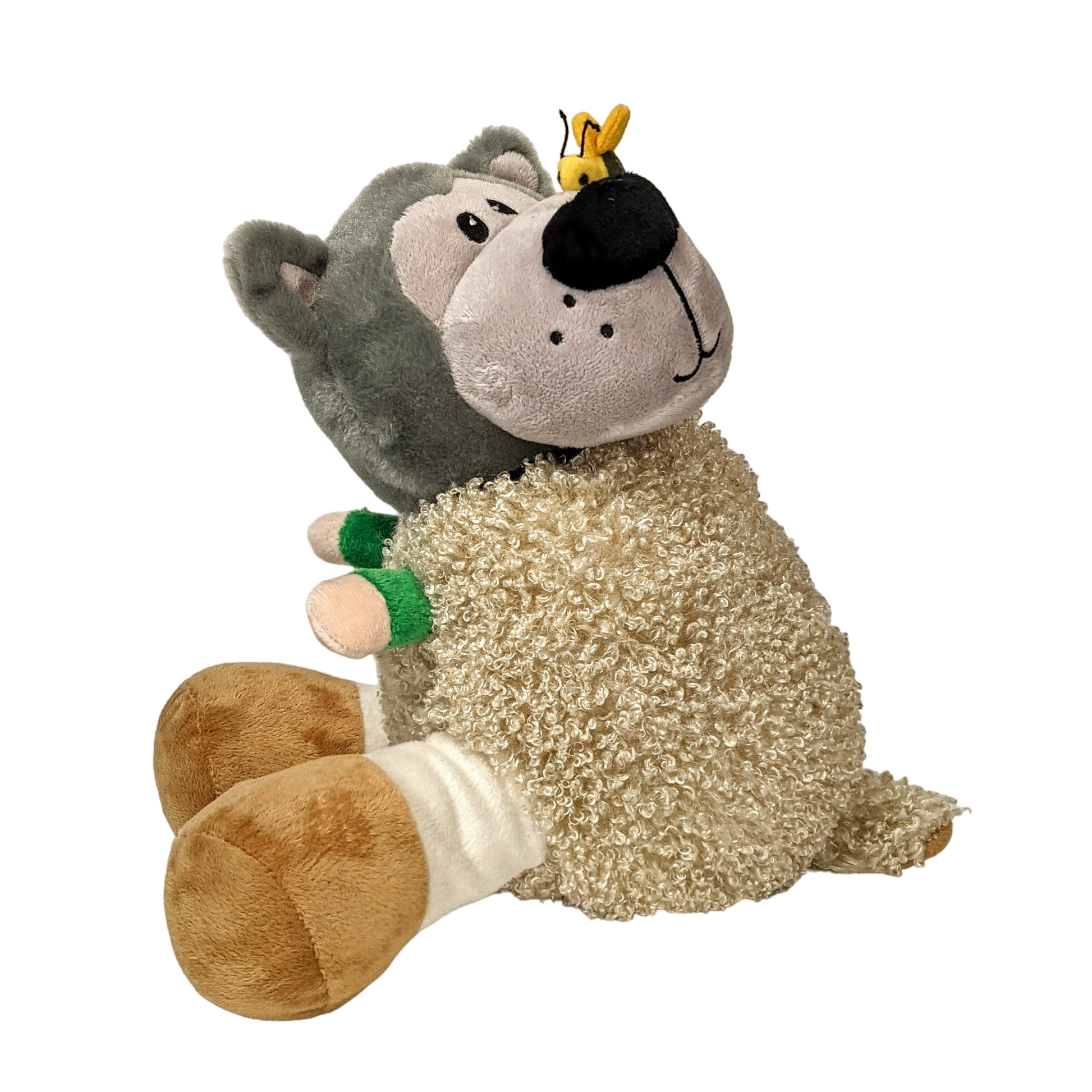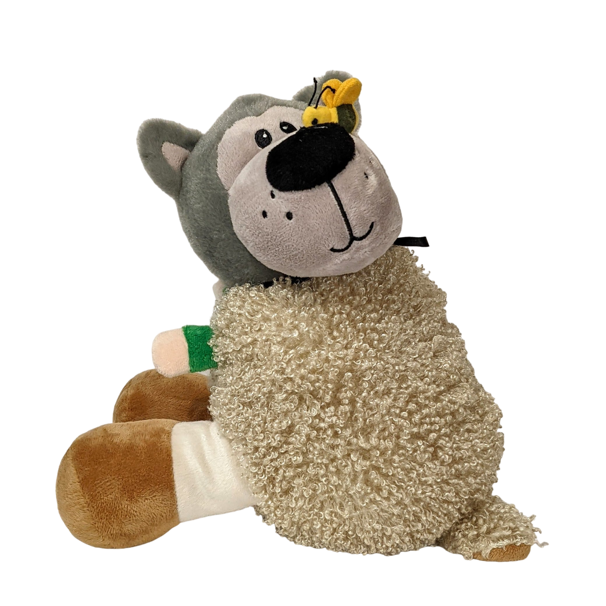 Description: Grey wolf head, brown sheep body, small arms, yellow bee friend.