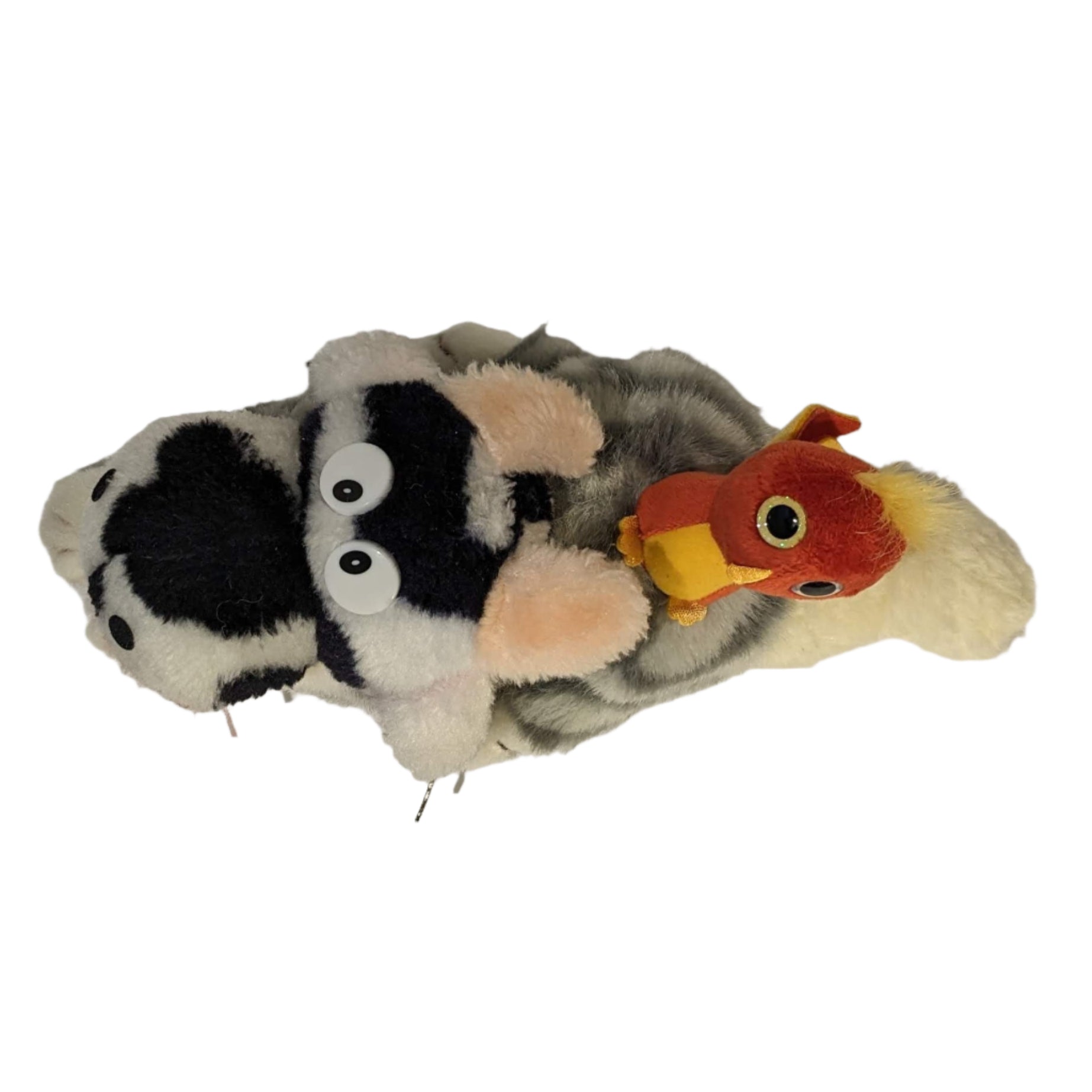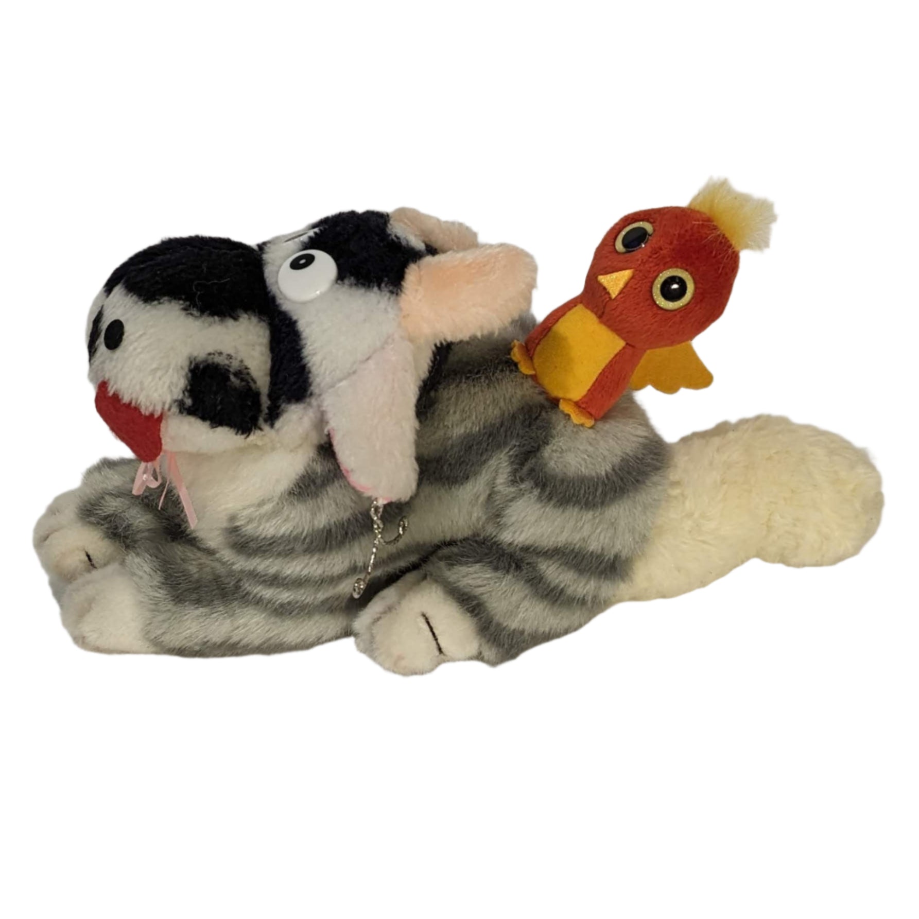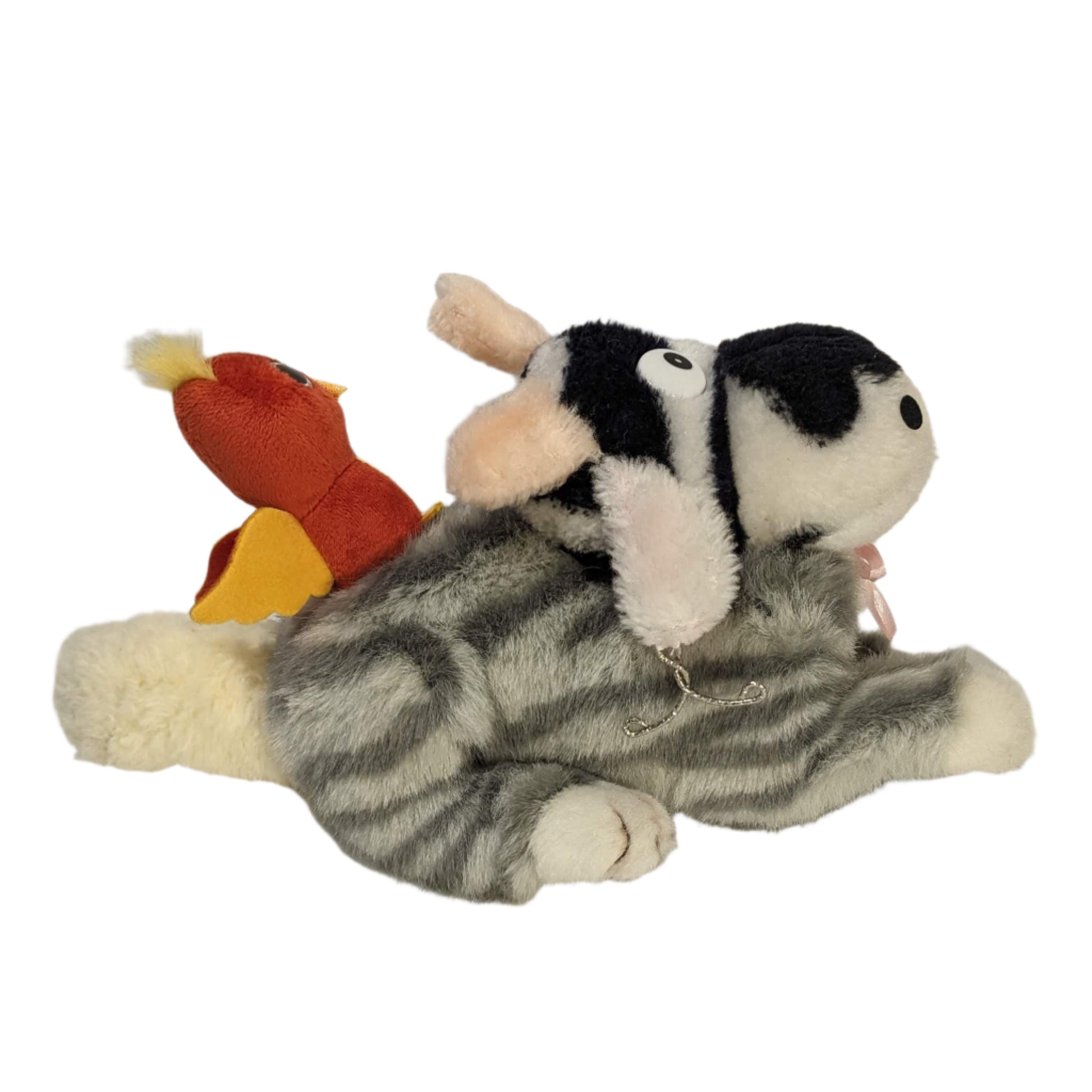 Description: Cow head with metal earrings, pink ribbon, grey striped cat body, large yellow tail. Has a yellow and orange bird on the back.